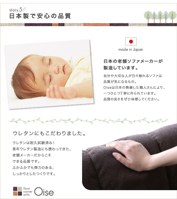 自分や大切な人が日々触れるソファは品質が気になるもの。Oiseは日本の熟練した職人さんにより、一つひとつ丁寧に作られています。品質の良さをぜひ体感してください。