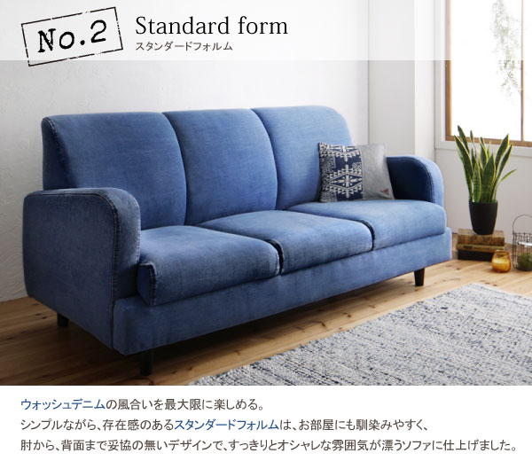 1.生デニム(ノンウォッシュの状態)2.ソファのカバーに裁断します。3.縫製をした後、風合いが出るまで数回、洗いを行います。4.ジーンズと同じ方法で洗いをかけることで、柔らかく、自然な風合いのデニムソファが完成します。