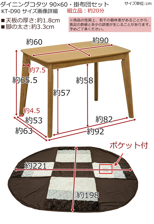 天板サイズ90×60cmの長方形ダイニングコタツと掛け布団の2点セットです