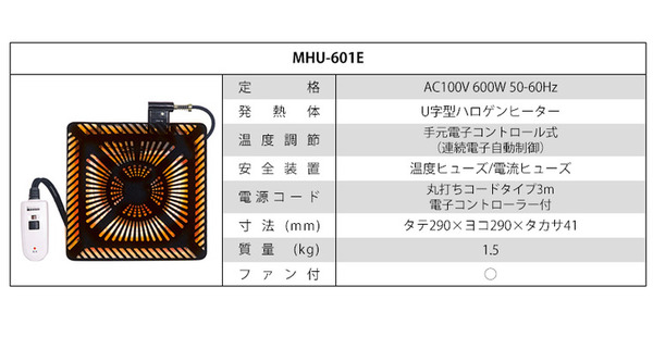 【成分性質】天板:アッシュ突板 塗装:ウレタン樹脂塗装(UV加工) ヒーター:MHU-601E ハロゲンヒーター(手元電子コントローラー)