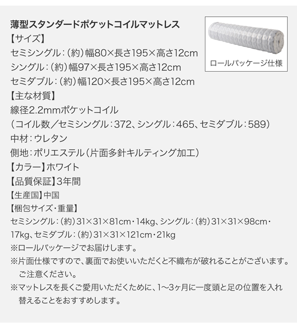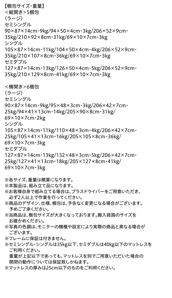 ※セミシングル・シングルは35 kg以下、セミダブルは40kg以下のマットレスをご利用下さい。
