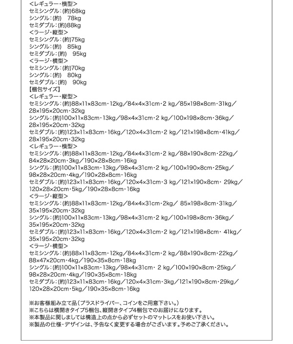 セミシングル:(約)88×11×83cm・12kg/84×4×31cm・2kg/88×190×8cm・22kg/88×47×20cm・4kg/190×35×8cm・18kg
