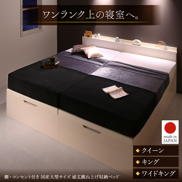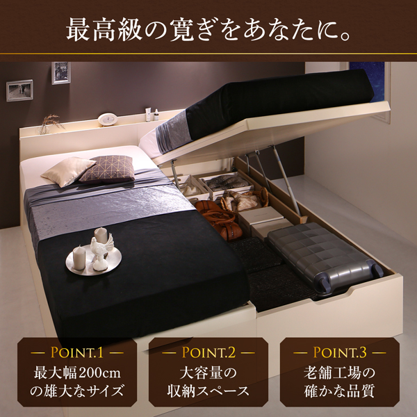 - お客様組立 収納ベッド ワイドK200 縦開き 【羊毛入りゼルトスプリングマットレス付】 フレームカラー:ホワイト/マットレスカラー:アイボリー お客様組立 棚・コンセント付き国産大型サイズ頑丈跳ね上げ収納ベッド ナヴァル Naval