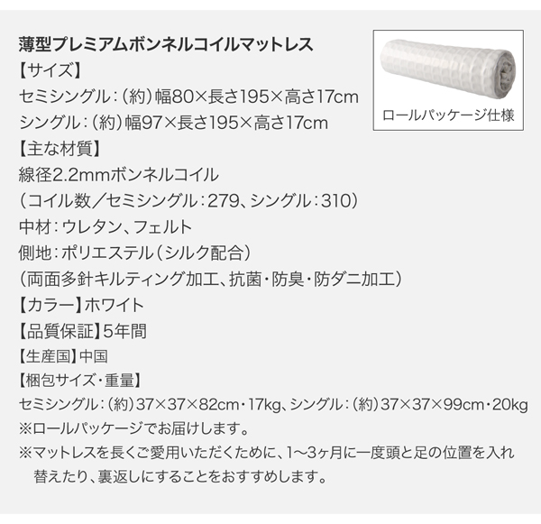 セミシングル:(約)幅80×長さ195×高さ17cm