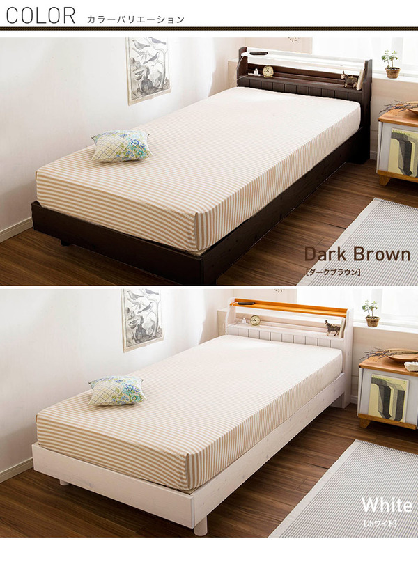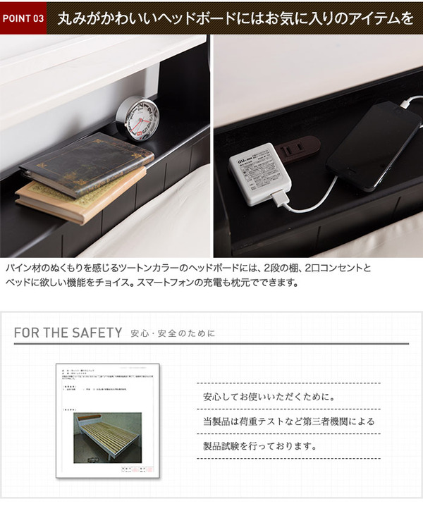 2口コンセント、棚付き、床面の高さを28cm、43cmと変えられる機能性の高さも魅力。