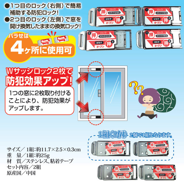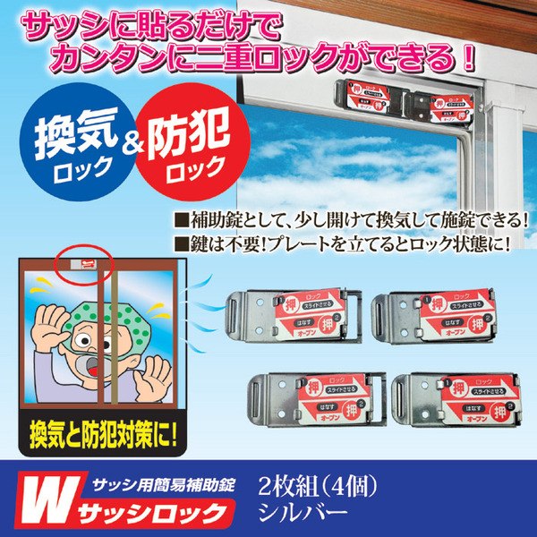 - Wサッシロック/サッシ用簡易補助錠 【2枚組み/4個】 薄型 シルバー〔防犯対策 換気グッズ〕