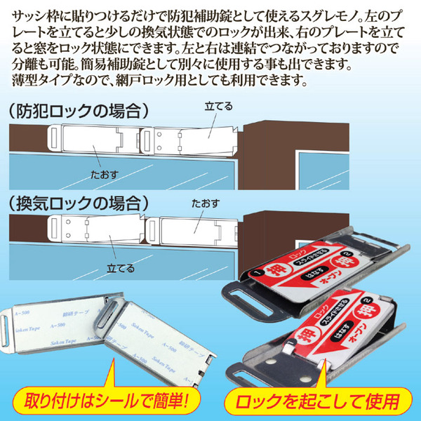 サッシ枠に貼りつけるだけで防犯補助錠として使えるスグレモノ。左のプレートを立てると少しの換気状態でのロックが出来、右のプレートを立てると窓をロック状態にできます。左と右は連結でつながっておりますので分離も可能。簡易補助錠として別々に使用する事も出できます。薄型タイプなので、網戸ロック用としても利用できます。