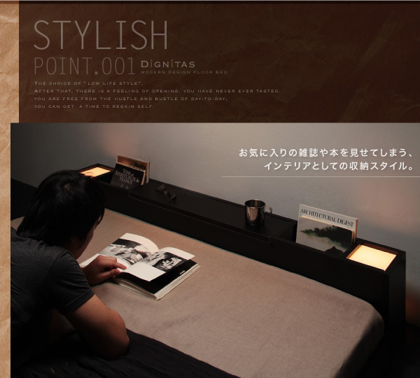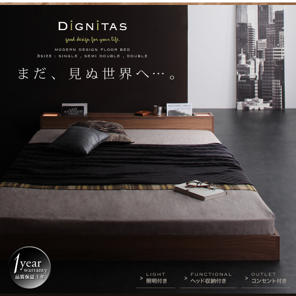 - フロアベッド セミダブル【dignitas】【ポケットコイルマットレス(レギュラー)付き】 フレームカラー:ウォルナットブラウン マットレスカラー:アイボリー 照明&隠し収納付き!モダンデザインフロアベッド【dignitas】ディニタス