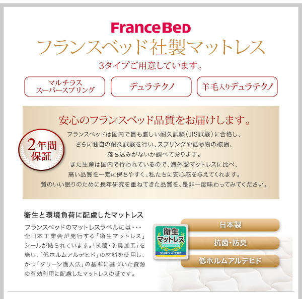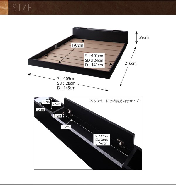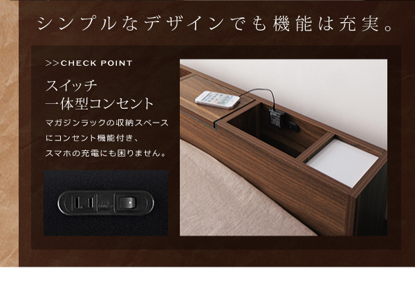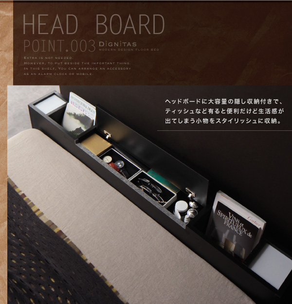 ヘッドボードに大容量の隠し収納付きで、ティッシュなど