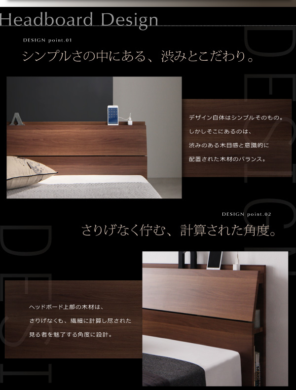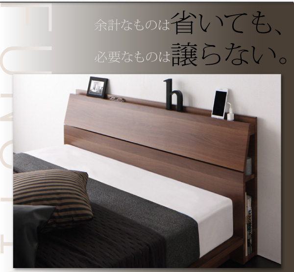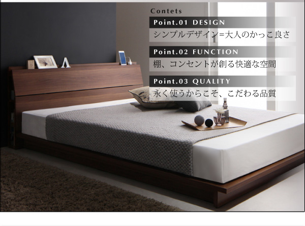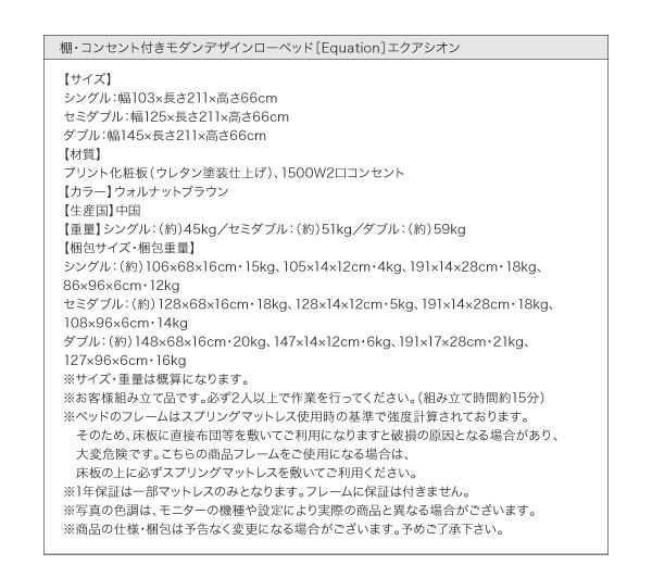 - ローベッド セミダブル【Equation】【デュラテクノマットレス付き】ウォルナットブラウン 棚・コンセント付きモダンデザインローベッド【Equation】エクアシオン