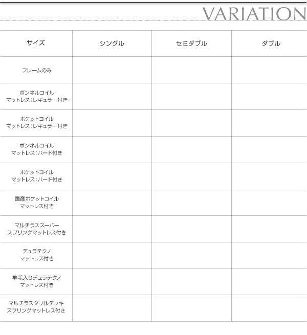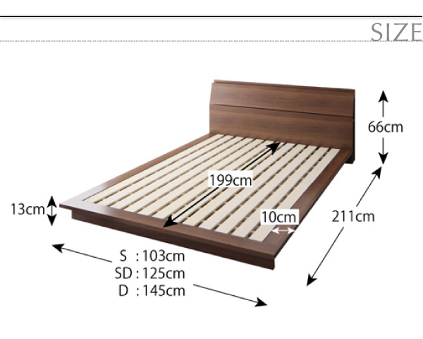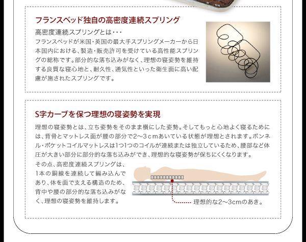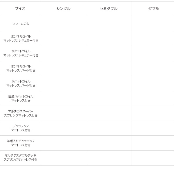 ※ベッドのフレームはスプリングマットレス使用時の基準で強度計算されております。そのため、床板に直接布団等を敷いてご利用になりますと破損の原因となる場合があり、大変危険です。こちらの商品フレームをご使用になる場合は、床板の上に必ずスプリングマットレスを敷いてご利用ください。