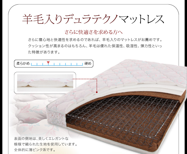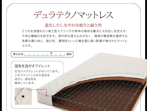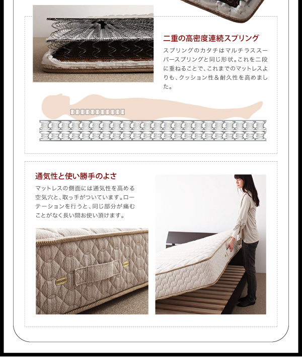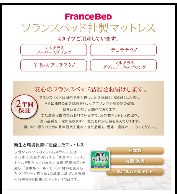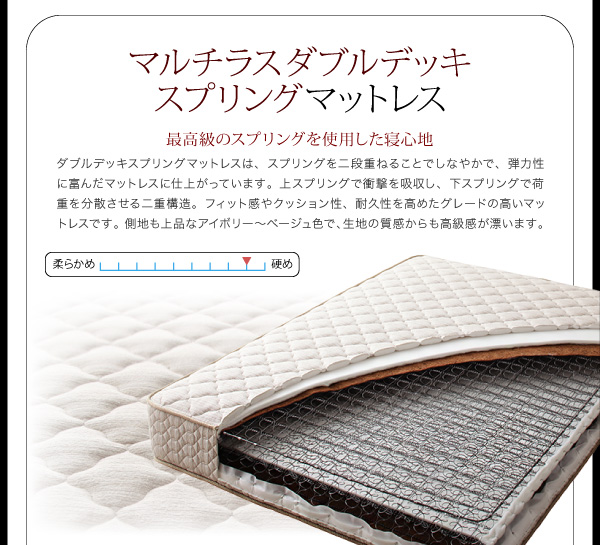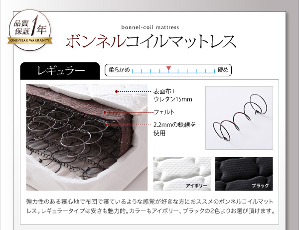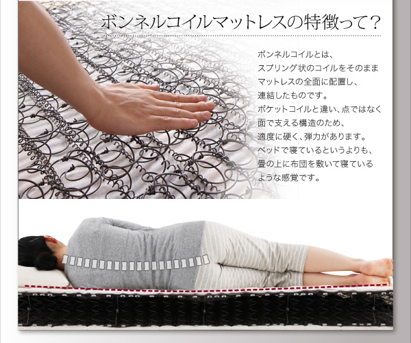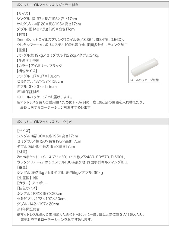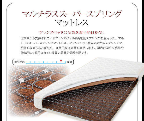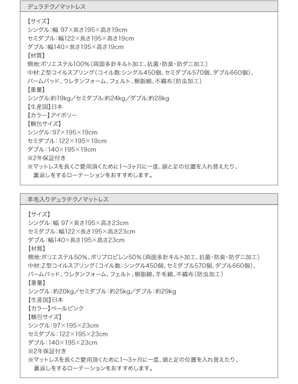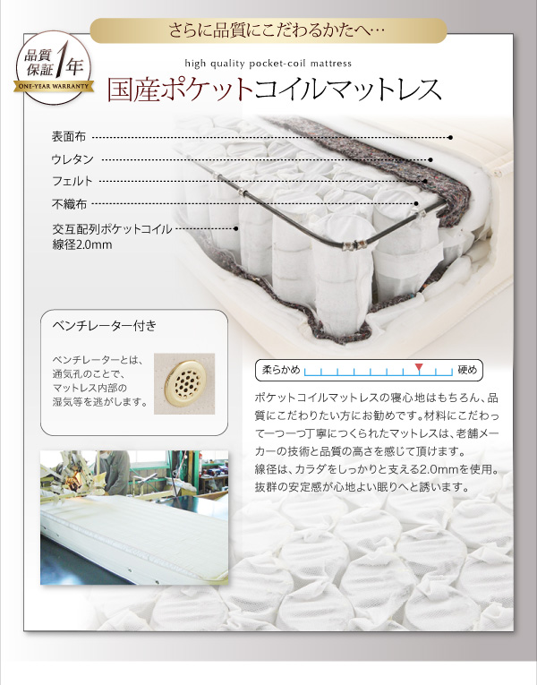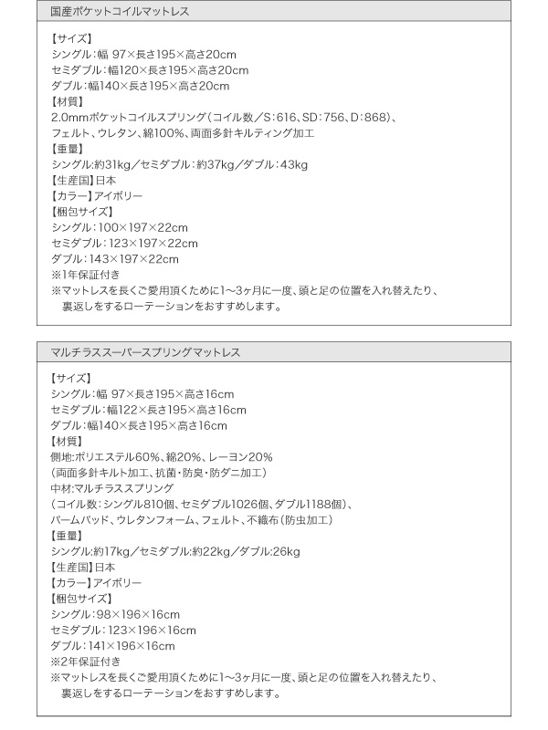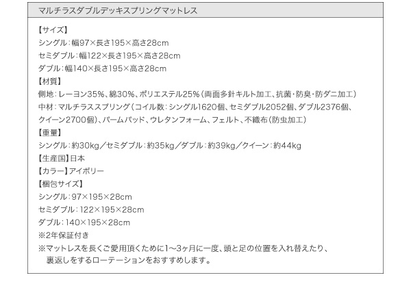 中材:マルチラススプリング(コイル数:シングル1620個、セミダブル2052個、ダブル2376個)、パームパッド、ウレタンフォーム、フェルト、不織布(防虫加工)