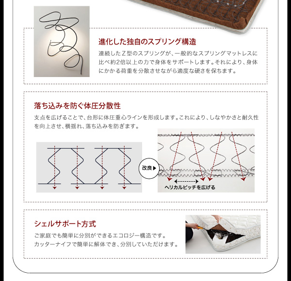 中材:Z型コイルスプリング(コイル数:シングル450個、セミダブル570個、ダブル660個)、