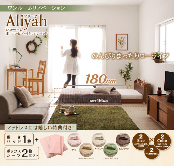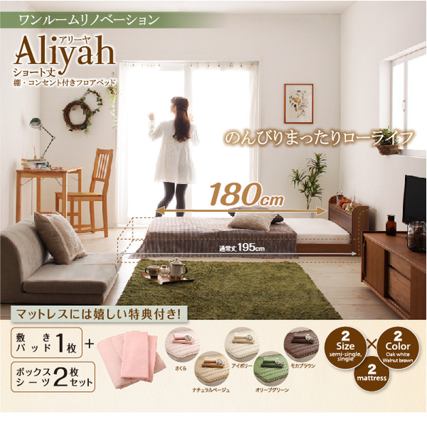 こちらは「フロアベッド セミシングル 【スタンダードボンネルコイルマットレス付】 フレームカラー:オークホワイト カバーカラー:オリーブグリーン ショート丈棚・コンセント付きフロアベッド Aliyah アリーヤ」の商品ページです。商品画像や説明文には色違いやサイズ違いの商品情報が載っている場合がございます。