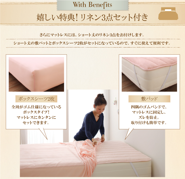 ショート丈の敷パットとボックスシーツ2枚がセットになっているので、