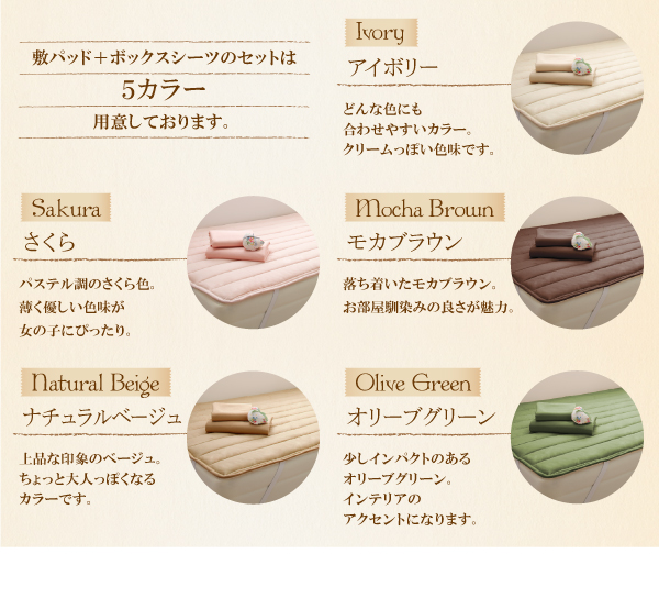 敷パッド+ボックスシーツのセットは5カラー用意しております。