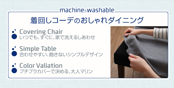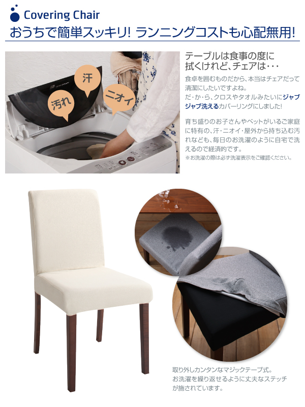 テーブルは食事の度に拭くけれど、チェアは・・・食卓を囲むものだから、本当はチェアだって清潔にしたいですよね。だ・か・ら、クロスやタオルみたいにジャブジャブ洗えるカバーリングにしました!