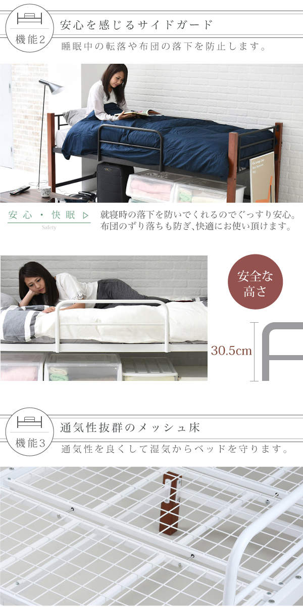 - シングルベッド 【フレームのみ/ミドルタイプ ホワイトブラウン】 幅102.5cm 下収納 サイドガード スチールフレーム付き