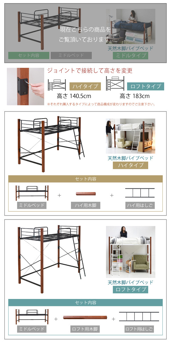 天然木の支柱がおしゃれなパイプベッド。高さはミドルタイプなので、ベッドの下には収納スペースがあり、プラスティックケースなどが入れられます。